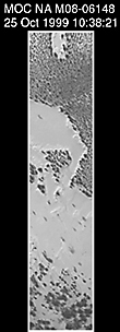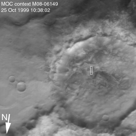 The MOC high resolution view (lower right, above) shows a 1.5 kilometer-(0.9 mile)-wide portion of the floor of Vishniac in the process of defrosting during southern spring. The bright areas are still frost-covered, while the darker areas are either defrosted or composed of darkened or "dirty" frost. The dark patches in the image seem to serve as sources for dark streaks of material that has either been blown across the landscape by wind, or has somehow caused the erosion of frost to create the streaks. Dark streaks follow the local topography, as might the wind that blew across this landscape. This pattern of spots and streaks was quite common on the defrosting south polar cap during the spring that lasted from early August 1999 to late December 1999.