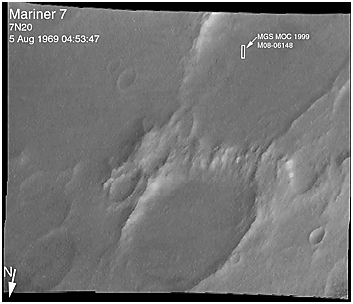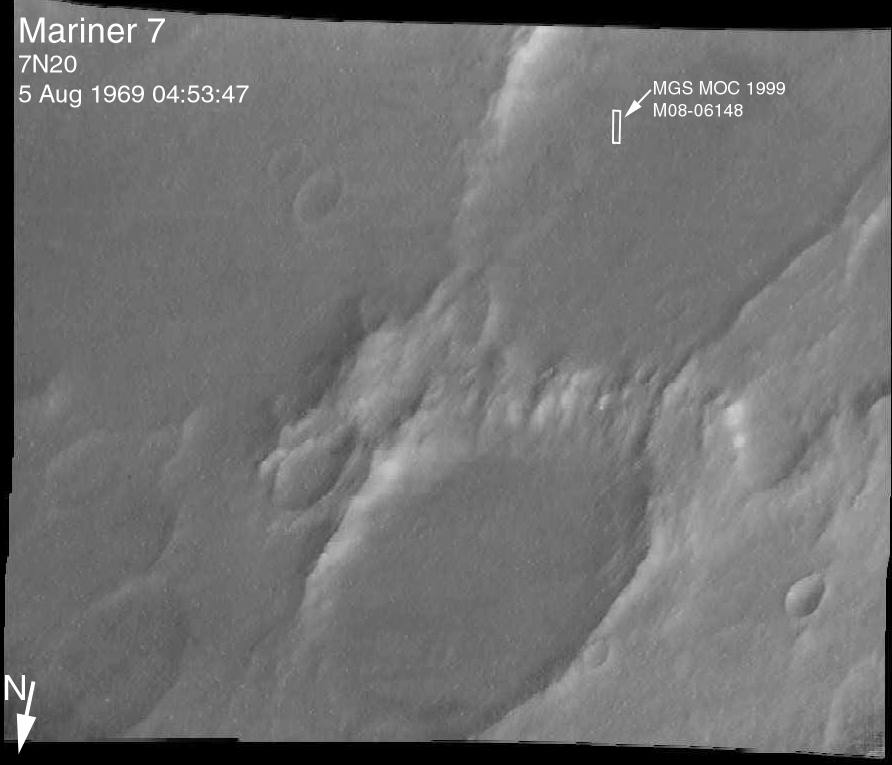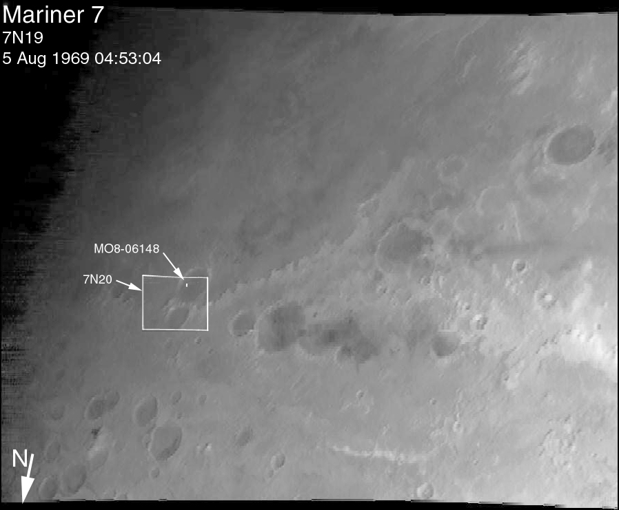 All images shown here are illuminated by sunlight from the lower right. Image orientation with north toward the bottom was selected in order to show the "footprint" visible in Mariner 7 image 7N20. The Mariner 7 images were recovered at Malin Space Science Systems from the original 7-track magnetic tapes, archived on CD-ROM by the JPL Data Preservation activity.