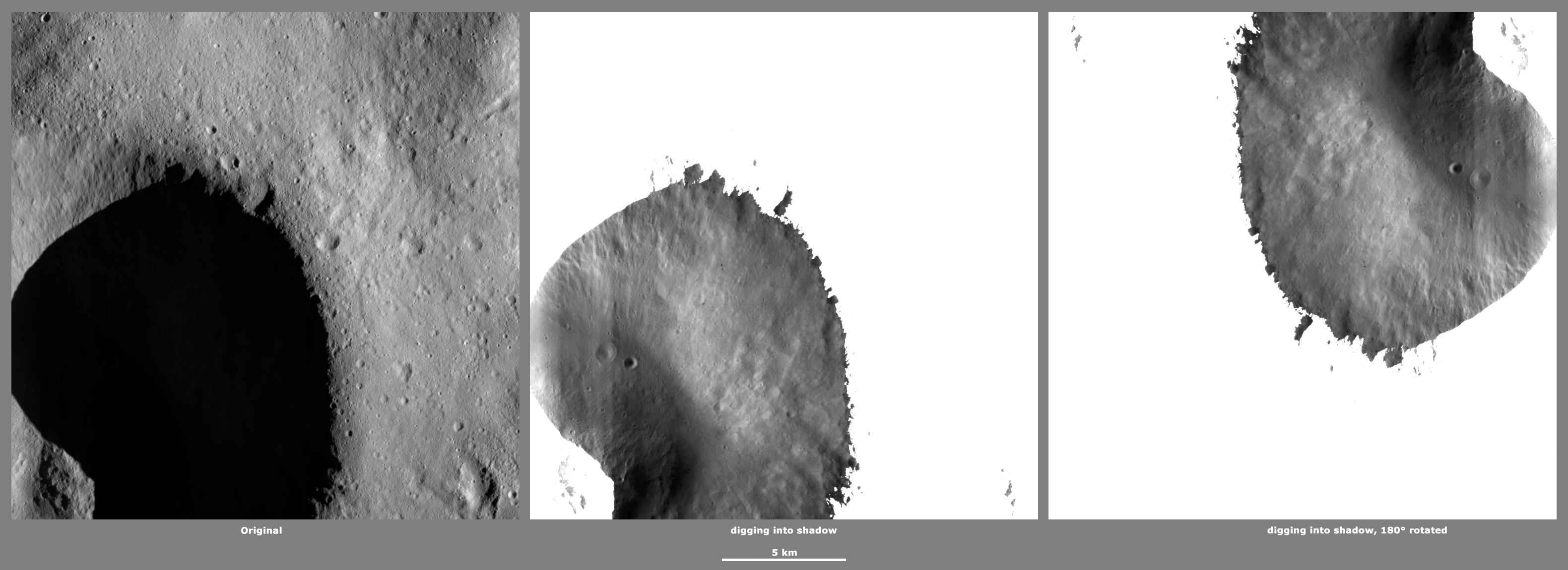 These Dawn framing camera (FC) images of Vesta demonstrate a special analytical technique, which results in shadowed areas of Vesta's surface becoming illuminated. These shadowed areas are usually in the interiors of craters. In this technique reflected light from crater walls, which are lit by the sun, is used to peer into the shadowed areas, which are not lit by the sun. The reflected light that scatters into the shadows is very faint. But, the superb dynamic range of the framing camera detector results in the enhancement of this weak signal. Thus, the surface in the shadowed areas is illuminated by reflected light from the surrounding topography. The left image shows the crater with a shadowed interior and the center image shows the illuminated shadowed interior. Interestingly, the light reflected into the shadowed area has a different geometry, which results in concave features like craters looking more like convex blisters. The illuminated image on the right is rotated by 180 degrees in order to adjust for this effect. In the illuminated, rotated image small craters and streak features resulting from slumping can be seen.