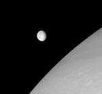 Rhea is frozen in this Cassini portrait, captured just before it glided in front of Saturn's northern hemisphere. The wispy streaks on Rhea's trailing side are partly visible in the west.