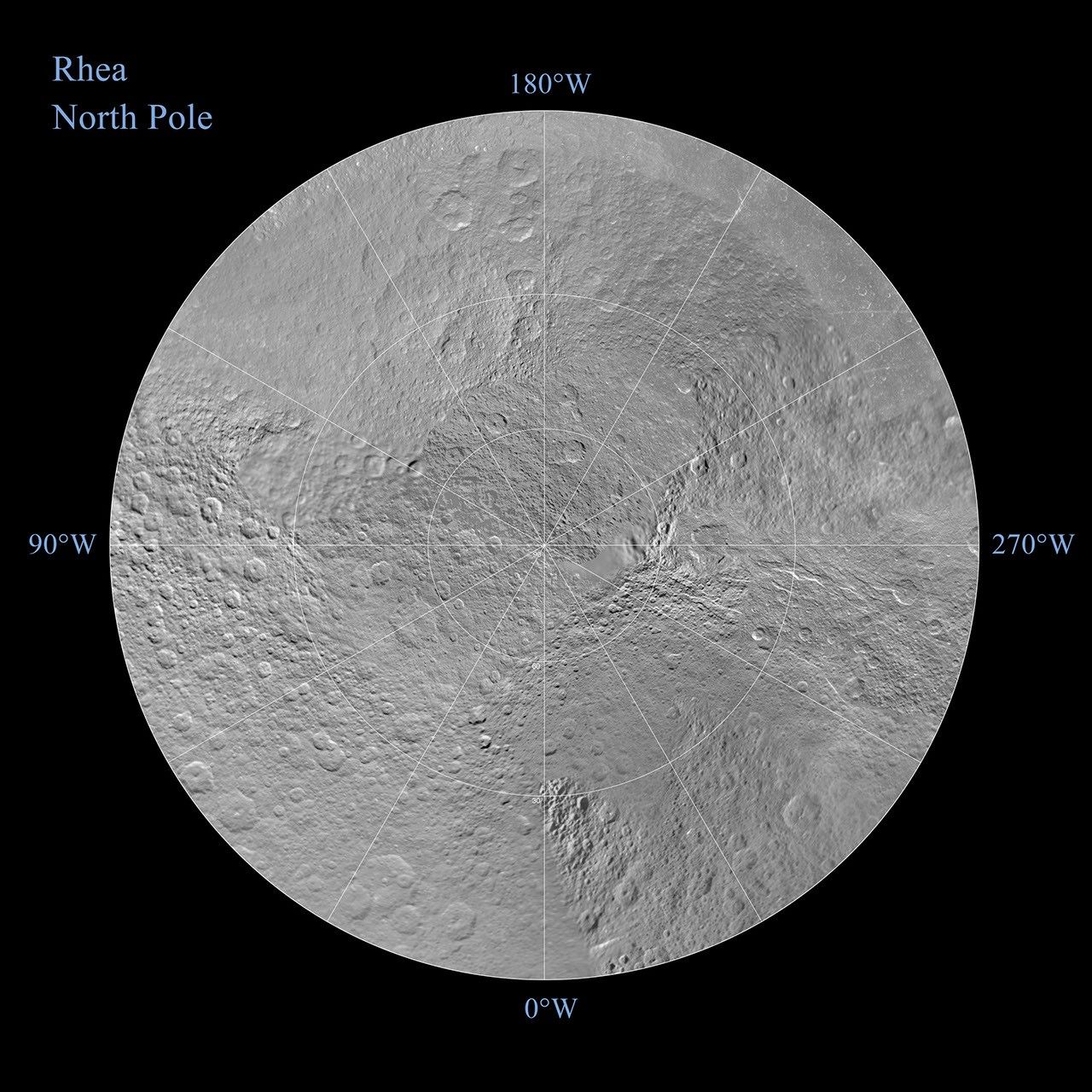The northern and southern hemispheres of Rhea are seen in these polar stereographic maps, mosaicked from the best-available NASA Cassini and Voyager images. Six Voyager images fill in gaps in Cassini's coverage of the moon's north pole.