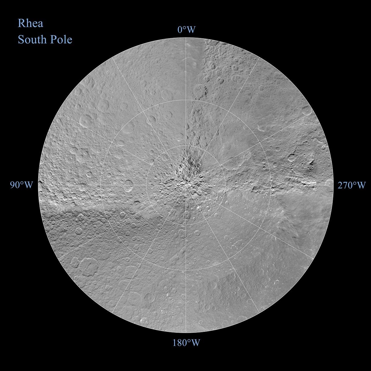 Each map is centered on one of the poles, and surface coverage extends to the equator. Grid lines show latitude and longitude in 30-degree increments. The scale in the full-size versions of these maps is 417 meters (1,370 feet) per pixel. The mean radius of Rhea used for projection of these maps is 764.1 kilometers (474.8 miles).