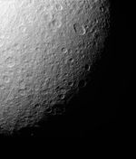 Cassini acquired this view during a distant flyby of Rhea (1,528 kilometers, or 949 miles across) on July 14, 2005.