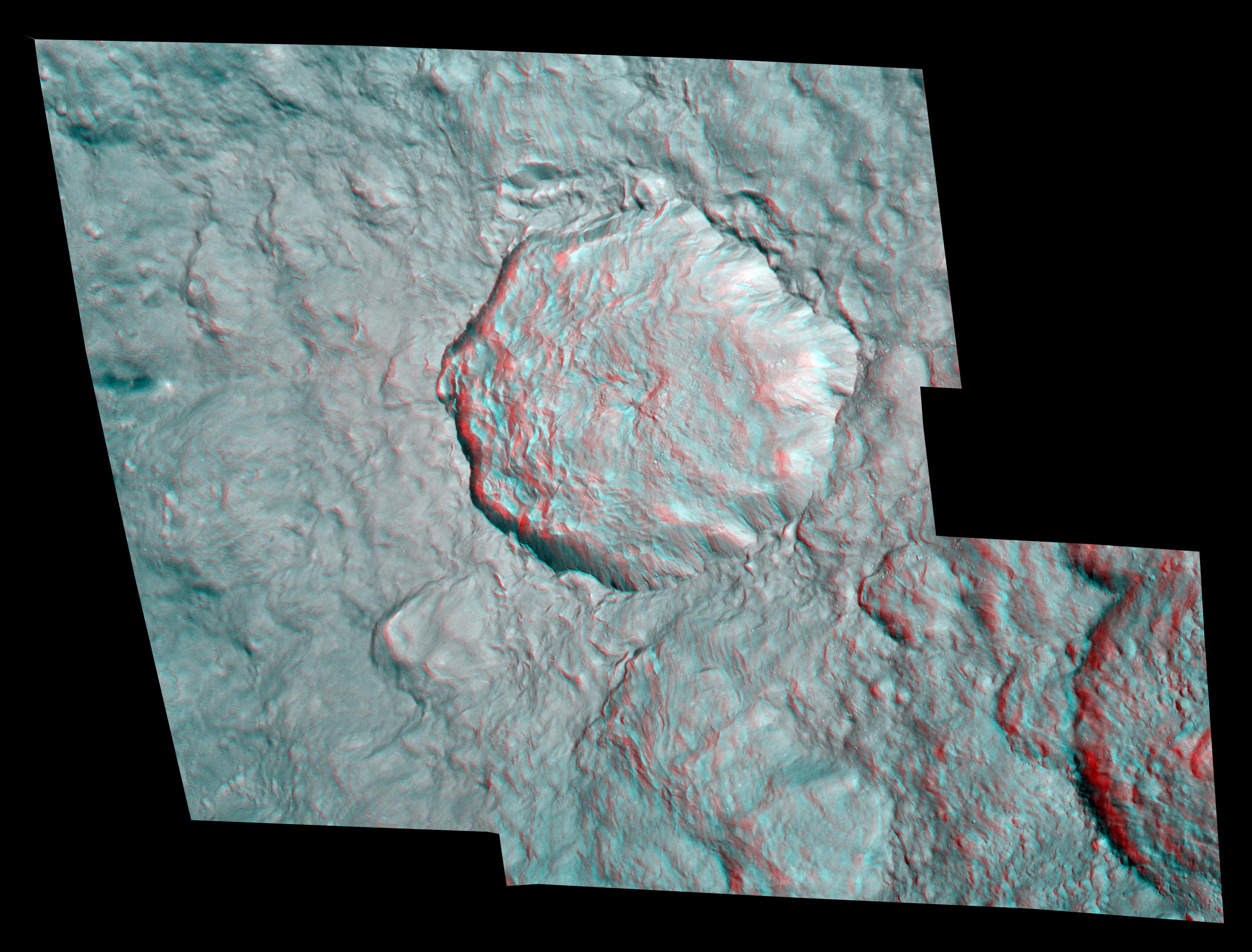 This stereo image is a mosaic consisting of seven Cassini spacecraft narrow-angle camera images. The view is an orthographic projection centered on 12 degrees south latitude, 112 degrees west longitude and has a resolution of 45 meters (148 feet) per pixel. An orthographic view is most like the view seen by a distant observer looking through a telescope. North is up.