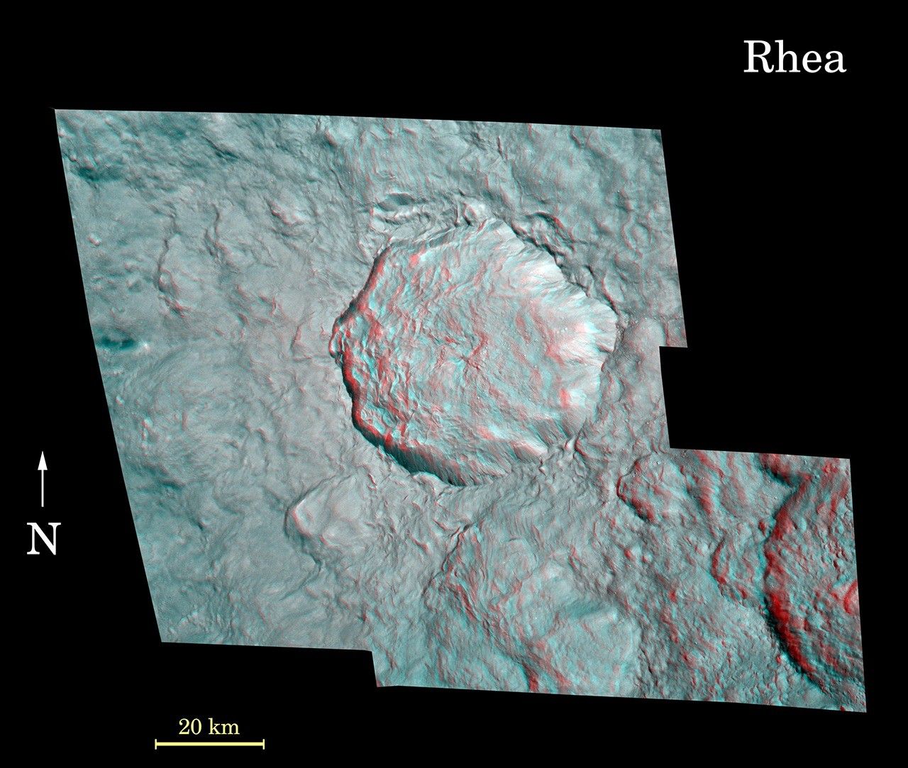 The clear filter images for this stereo image were taken from distances ranging from about 17,000 kilometers (10,600 miles, for the red-colored image) to 7,500 kilometers (4,700 miles, for the blue/green-colored image) from Rhea.