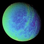Bright, wispy markings stretch across a region of darker terrain on Saturn's moon Rhea. In this extreme false-color view, the roughly north-south fractures occur within strips of material (which appear greenish here) that are a different color from the surrounding cratered landscape.