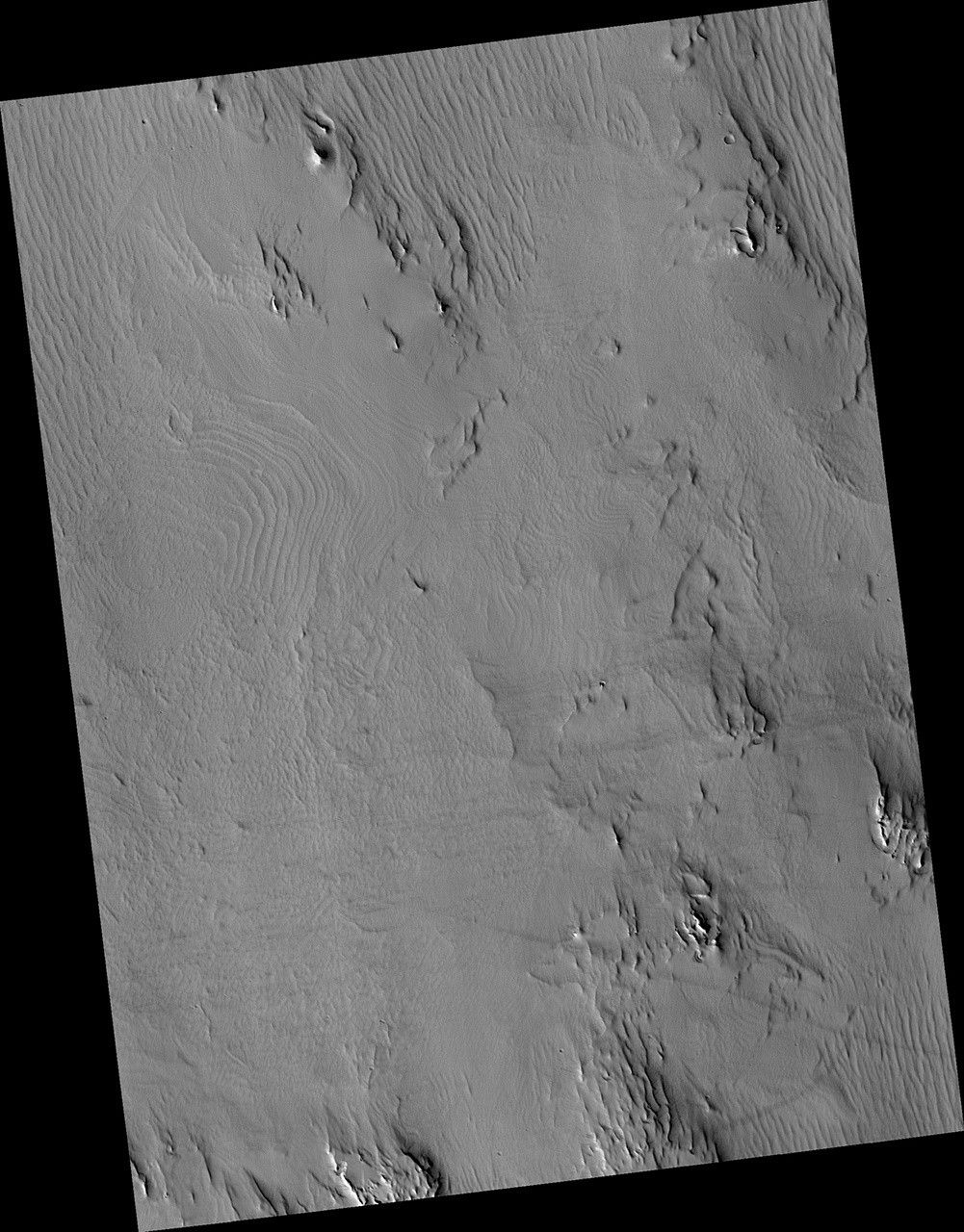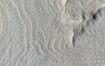 The surface of this image looks wavy, like that of the sea. These wave shapes are the result of erosion: the removal of material, which has been ongoing for millions, if not billions, of years. This erosion is likely performed by the action of wind and has revealed layered rock that was deposited in this area in the ancient past.