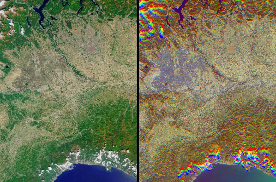 Cities with tall buildings appear to be "rough" surfaces because of their vertical structures and appear in red-orange hues. Using this display technique, the cities of Milan and Vercelli can be readily identified. The area of orange pixels situated roughly at the center of the purple inundation area indicates the location of Vercelli, and Milan can be located by the large orange area that appears to the northeast of Vercelli. To a lesser extent, the cities of Novara, Pavia, Galliate, Mortara and Vigevano are also identifiable by their orange hues.