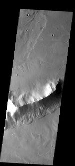 Note: this THEMIS visual image has not been radiometrically nor geometrically calibrated for this preliminary release. An empirical correction has been performed to remove instrumental effects. A linear shift has been applied in the cross-track and down-track direction to approximate spacecraft and planetary motion. Fully calibrated and geometrically projected images will be released through the Planetary Data System in accordance with Project policies at a later time.