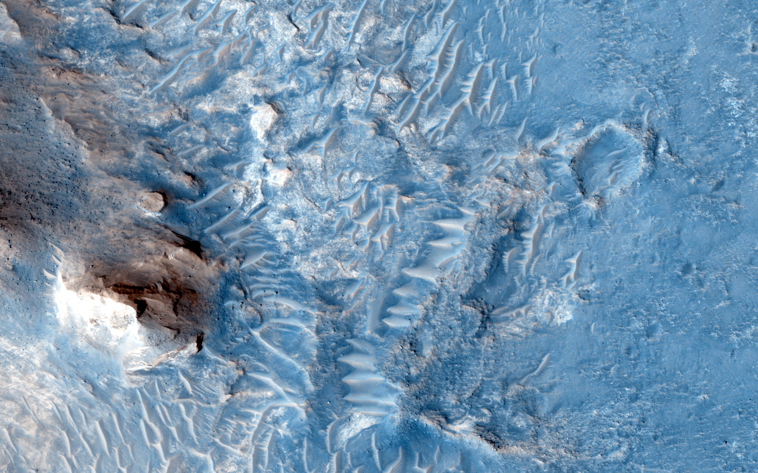 In the area between Crommelin and Firsoff craters, we see heavily cratered terrain with deposits that record Martian geologic history and stratigraphy.