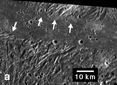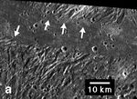 Embayment of ridges and troughs in a portion of the Sippar Sulcus area of Jupiter's moon Ganymede in this image from NASA's Galileo spacecraft is interpreted as evidence that the low-lying area was filled in by flooding with low-viscosity material, such as water or water-ice slush lavas. Bays of the material appeared to have formed in troughs (indicated by arrows) between the ridges.
