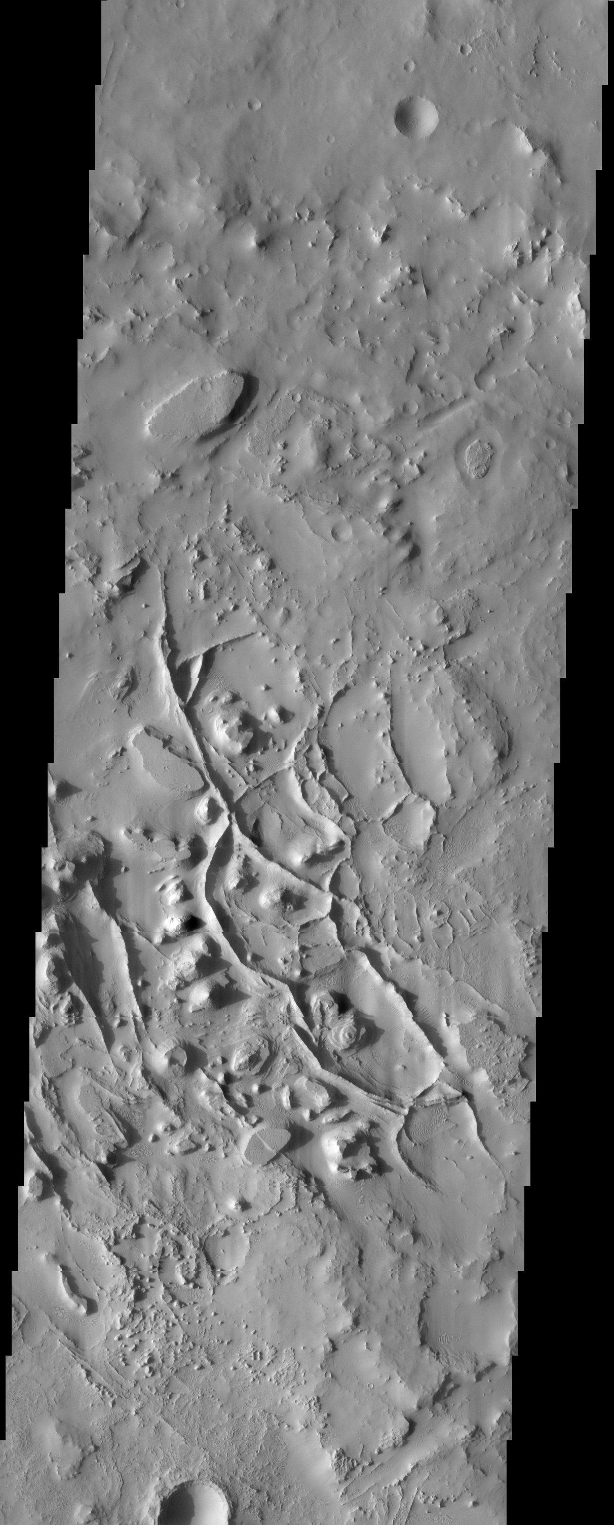 Note: this THEMIS visual image has not been radiometrically nor geometrically calibrated for this preliminary release. An empirical correction has been performed to remove instrumental effects. A linear shift has been applied in the cross-track and down-track direction to approximate spacecraft and planetary motion. Fully calibrated and geometrically projected images will be released through the Planetary Data System in accordance with Project policies at a later time.