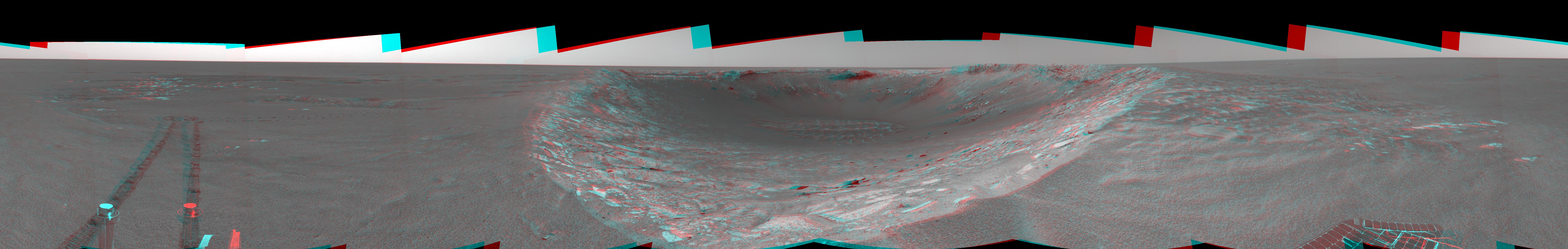 This three-dimensional view in the cylindrical-perspective projection was created from navigation camera images that NASA's Mars Exploration Rover Opportunity acquired on sol 103 (May 8, 2004). Opportunity traversed approximately 13 meters (about 43 feet) farther south along the eastern rim of "Endurance Crater" before reaching the beginning of the "Karatepe" area. Scientists believe this layered band of rock may be a good place to begin studying Endurance because it is less steep and more approachable than the rest of the crater's rocky outcrops.