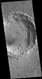 Today's VIS image is of an unnamed crater in Chryse Planitia. There are several concentric ridges visible on the right side of this image. These features formed at the time of impact and are part of the rim structure of this crater. Numerous gullies dissect the rim and a small dune field is located on the floor of the crater.