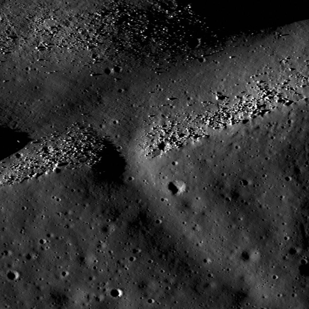 Rima Calippus in northwest Mare Serenitatis, boulders on the larger branch are possibly outcrop waiting to be sampled. LROC NAC M102078117, image width is 1600 meters.