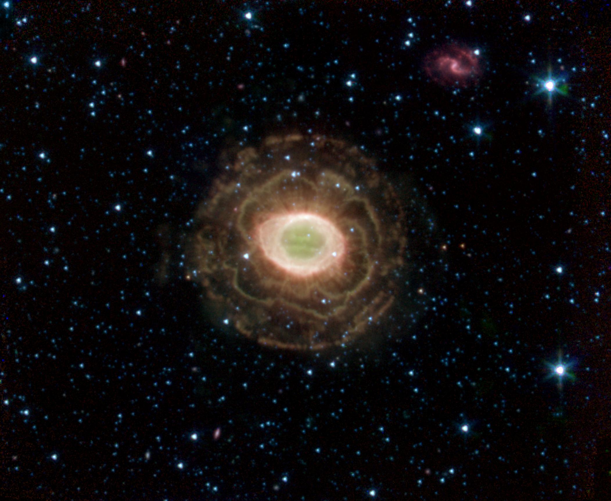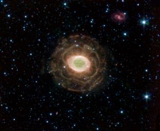 The "ring" is a thick cylinder of glowing gas and dust around the doomed star. As the star begins to run out of fuel, its core becomes smaller and hotter, boiling off its outer layers. The telescope's infrared array camera detected this material expelled from the withering star. Previous images of the Ring Nebula taken by visible-light telescopes usually showed just the inner glowing loop of gas around the star. The outer regions are especially prominent in this new image because Spitzer sees the infrared light from hydrogen molecules. The molecules emit infrared light because they have absorbed ultraviolet radiation from the star or have been heated by the wind from the star.