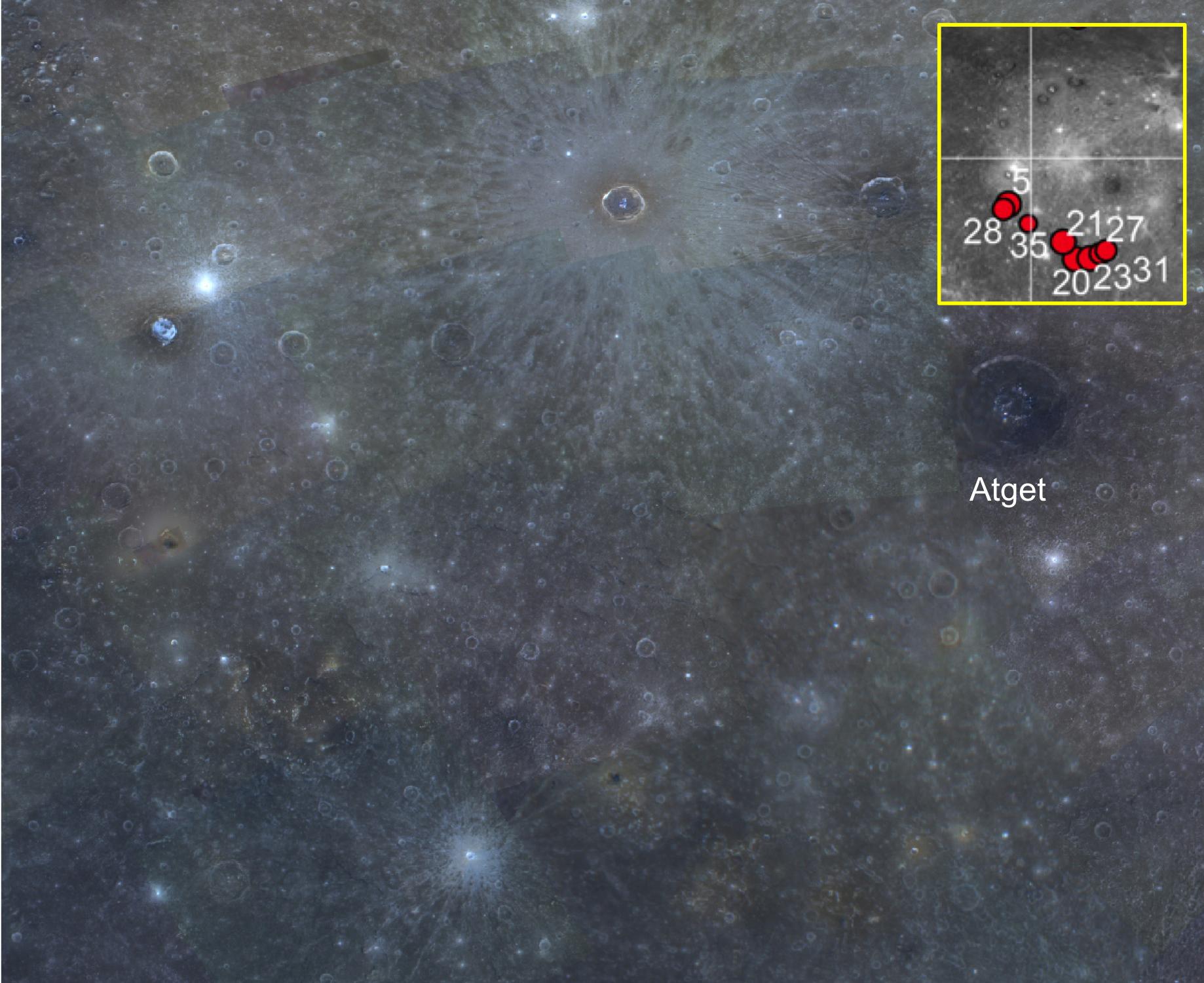 This image is part of MDIS's high-resolution 3-color mosaic. The 3-color campaign is a major mapping activity in MESSENGER's extended mission. It complements the 8-color base map (at an average resolution of 1 km/pixel) acquired during MESSENGER's primary mission by imaging Mercury's surface in a subset of the color filters at the highest resolution possible. The three narrow-band color filters are centered at wavelengths of 430 nm, 750 nm, and 1000 nm, and image resolutions generally range from 100 to 400 meters/pixel in the northern hemisphere. The inset is part of Fig. 4 of L. Kerber et al., (2011), Planet. Space Sci. 59, 1895-1909.