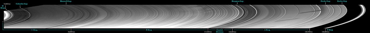 Bright spokes, consisting of tiny particles elevated above the ring plane and surrounded by the dark outer B ring, can also be seen near the middle of the mosaic. See PIA08877 to learn more about these ghostly markings.