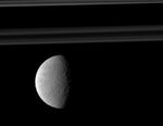 See PIA09895 to learn more about Rhea's terrain. In this image, the moon is closer to Cassini than the rings are. This view looks toward the northern, sunlit side of the rings from just above the ringplane. Lit terrain seen here is on the trailing hemisphere of Rhea (1,528 kilometers, or 949 miles across). North on Rhea is up and rotated 1 degree to the left.
