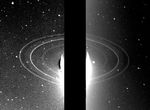 These two 591-second exposures of the rings of Neptune were taken with the clear filter by the Voyager 2 wide-angle camera on Aug. 26, 1989 from a distance of 280,000 kilometers (175,000 miles). The two main rings are clearly visible and appear complete over the region imaged. The time between exposures was one hour and 27 minutes. [During this period the bright ring arcs in the outer bright ring were not visible in either picture (they were unfortunately on the opposite side of the planet for each exposure).] Also visible in this image is the inner faint ring at about 42,000 kilometers (25,000 miles) from the center of Neptune, and the faint band which extends smoothly from the 53,000 kilometer (33,000 miles) ring to roughly halfway between the two bright rings. Both of these newly discovered rings are broad and much fainter than the two narrow rings. These long exposure images were taken while the rings were back-lighted by the sun at a phase angle of 135 degrees. This viewing geometry enhances the visibility of dust and allows fainter, dusty parts of the ring to be seen. The bright glare in the center is due to over-exposure of the crescent of Neptune. The two gaps in the upper part of the outer ring in the image on the left are due to blemish removal in the computer processing. Numerous bright stars are evident in the background. Both bright rings have material throughout their entire orbit, and are therefore continuous. The Voyager Mission is conducted by JPL for NASA's Office of Space Science and Applications.