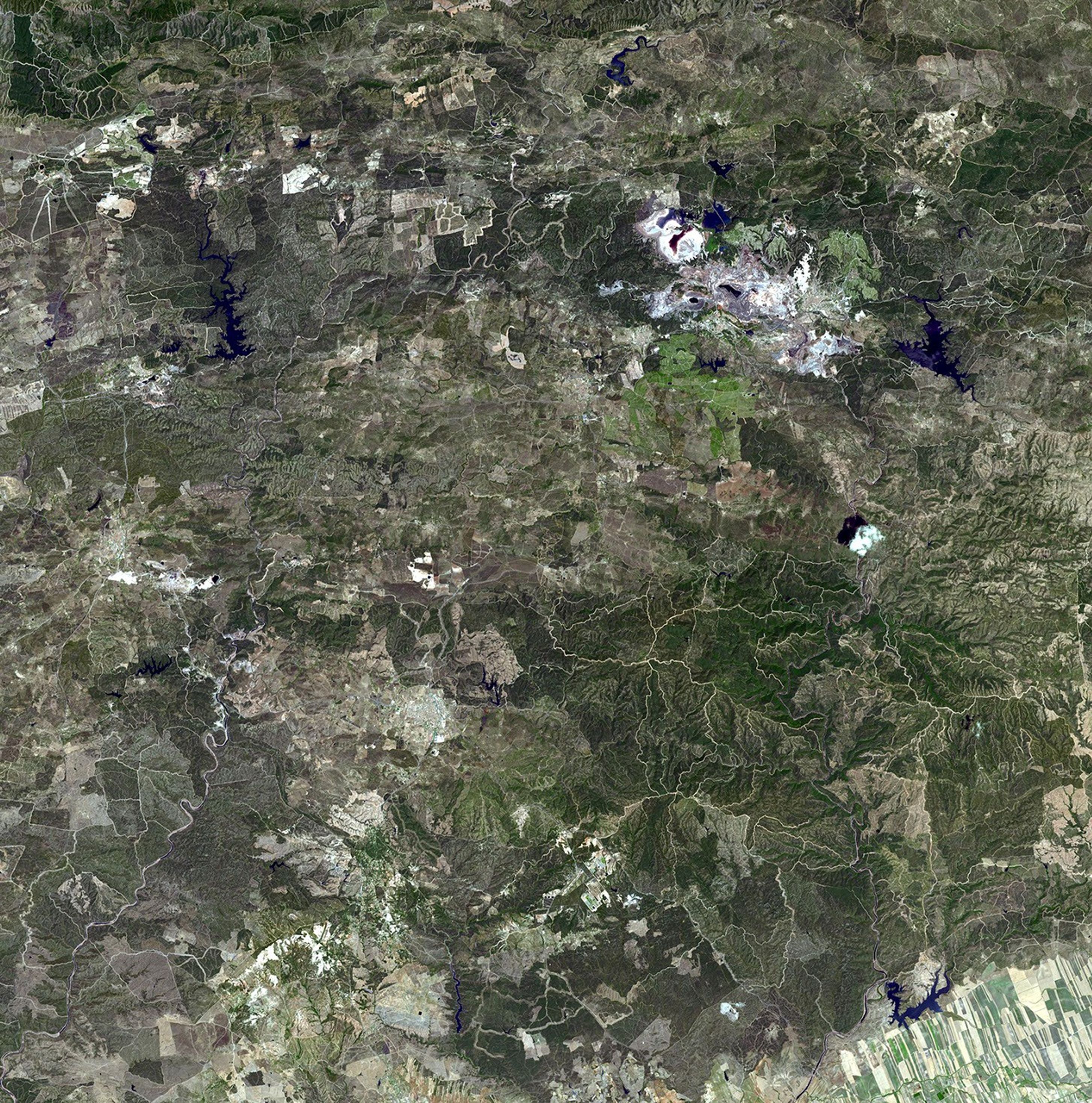 The Rio Tinto (red river in English) is a river in southwestern Spain that originates in the Sierra Morena mountains of Andalusia. It flows generally south-southwest, reaching the Gulf of Càdiz at Huelva. Since ancient times, a site along the river has been mined for copper, silver, gold, and other minerals. In approximately 3,000 BCE, Iberians and Tartessians began mining the site, followed by the Phoenicians, Greeks, Romans, Visigoths, and Moors. After a period of abandonment, the mines were rediscovered in 1556 and the Spanish government began operating them once again in 1724. As a result of the mining, RÃo Tinto is notable for being very acidic (pH 2) and its deep reddish hue is due to iron dissolved in the water. Acid mine drainage from the mines leads to severe environmental problems due to the heavy metal concentrations in the river. In 1873, the multinational Rio Tinto Company was formed to operate the mines; by the end of the 20th century it had become one of the world's largest mining companies, although it no longer controls the Rio Tinto mines; these are now owned by EMED Mining plc. The image was acquired July 16, 2007, covers an area of 43.5 x 43.5 km, and is located at 37.7 degrees north latitude, 6.6 degrees west longitude.