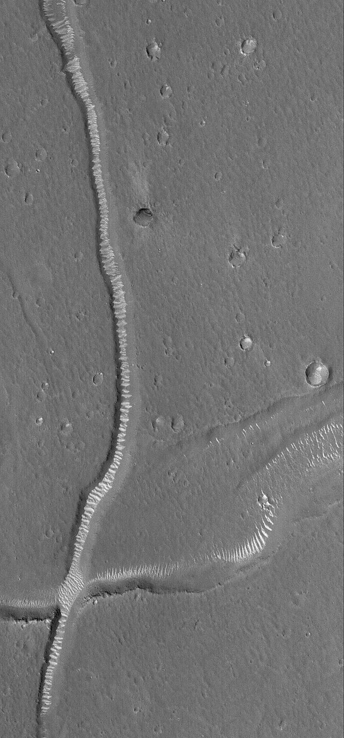 This Mars Global Surveyor (MGS) Mars Orbiter Camera (MOC) image shows light-toned ripples covering the floors of troughs in the Adamas Labyrinthus region of northern Elysium Planitia. The ripple crests generally run perpendicular to the trend of each trough, indicating that the dominant winds involved in shaping these ripples blow up and down, through the troughs, independent of the direction of winds that blow across the plains outside the troughs.