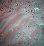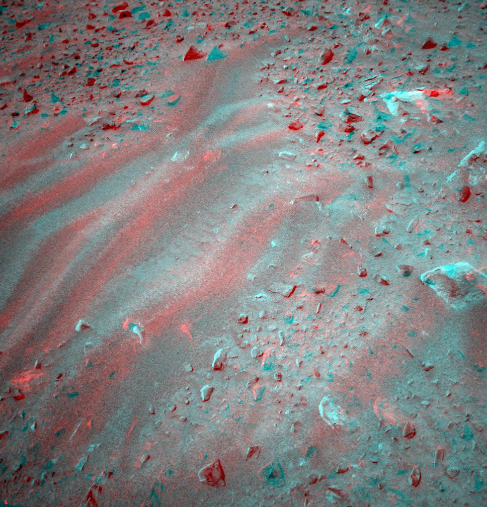 This is a three-dimensional stereo anaglyph of an image taken by the front navigation camera onboard the Mars Exploration Rover Spirit, showing an interesting patch of rippled soil. Spirit took this image on sol 37 (Feb. 9, 2004) after completing the longest drive ever made by a rover on another planet - 21.2 meters (69.6 feet). On sol 38 scientists plan to investigate this interesting location with the microscopic imager and Moessbauer spectrometer on Spirit's instrument deployment device.