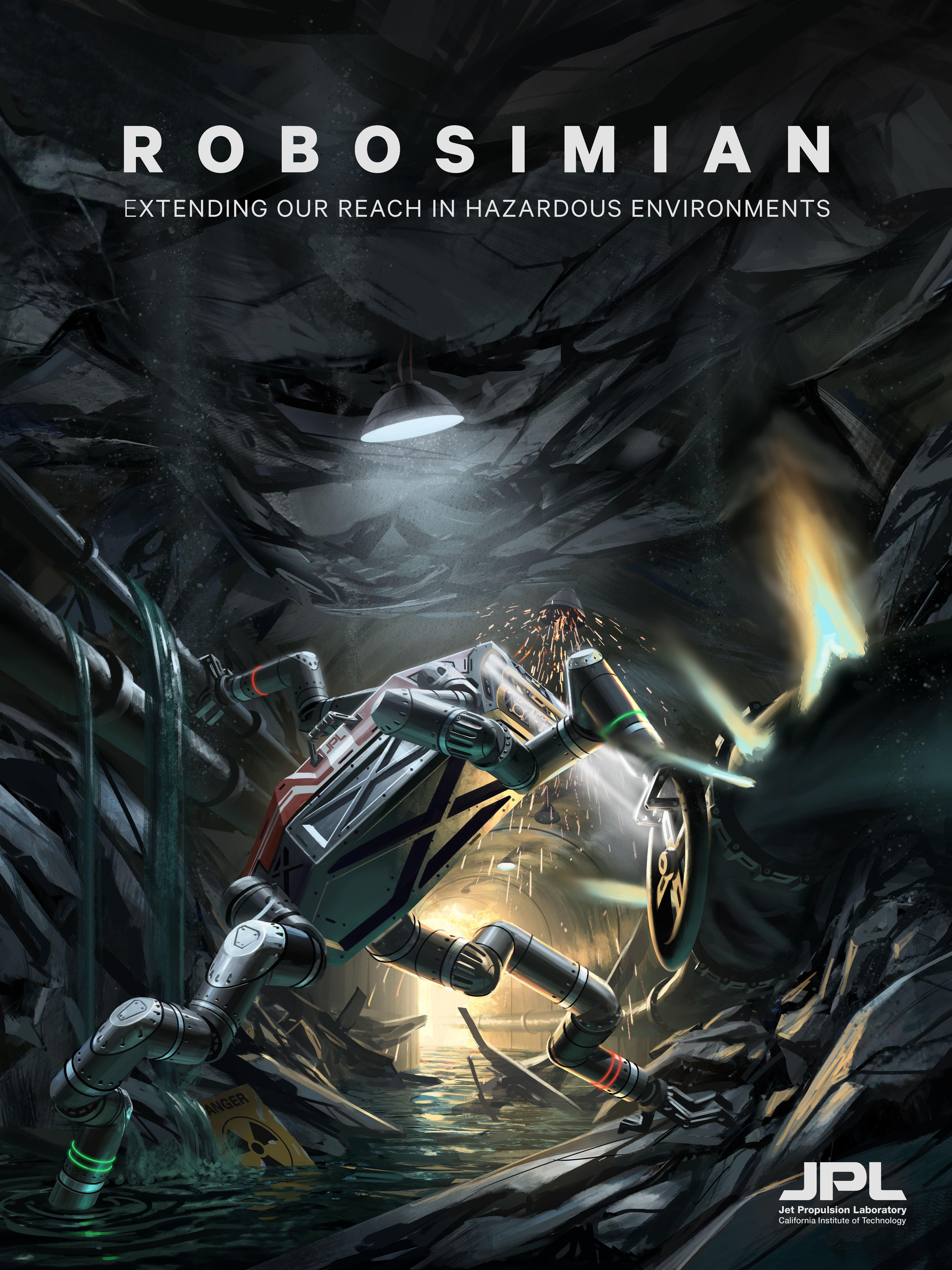 RoboSimian is an ape-like robot that moves around on four limbs. It was designed and built at the Jet Propulsion Laboratory in Pasadena, California. It will compete in the 2015 DARPA Robotics Challenge Finals. To get the robot in shape for the contest, researchers at JPL are collaborating with partners at University of California, Santa Barbara, and the California Institute of Technology.