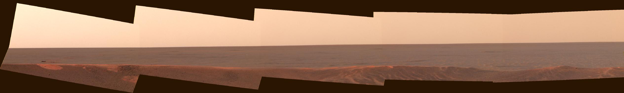 This mosaic of images from the Mars Exploration Rover Opportunity panoramic camera looks to the southeast from inside Eagle Crater. This was among the first peeks out into the plains, revealing the enigmatic dark feature dubbed "Bounce" rock, seen on the left side of the mosaic. This feature is right next to one of the large bounce marks that the airbag-packaged rover made as it was bouncing across the plains during landing. This enhanced color mosaic was made on sol 36 from the camera's the infrared (750 nanometer), green (530 nanometer), and violet (430 nanometer) filters.