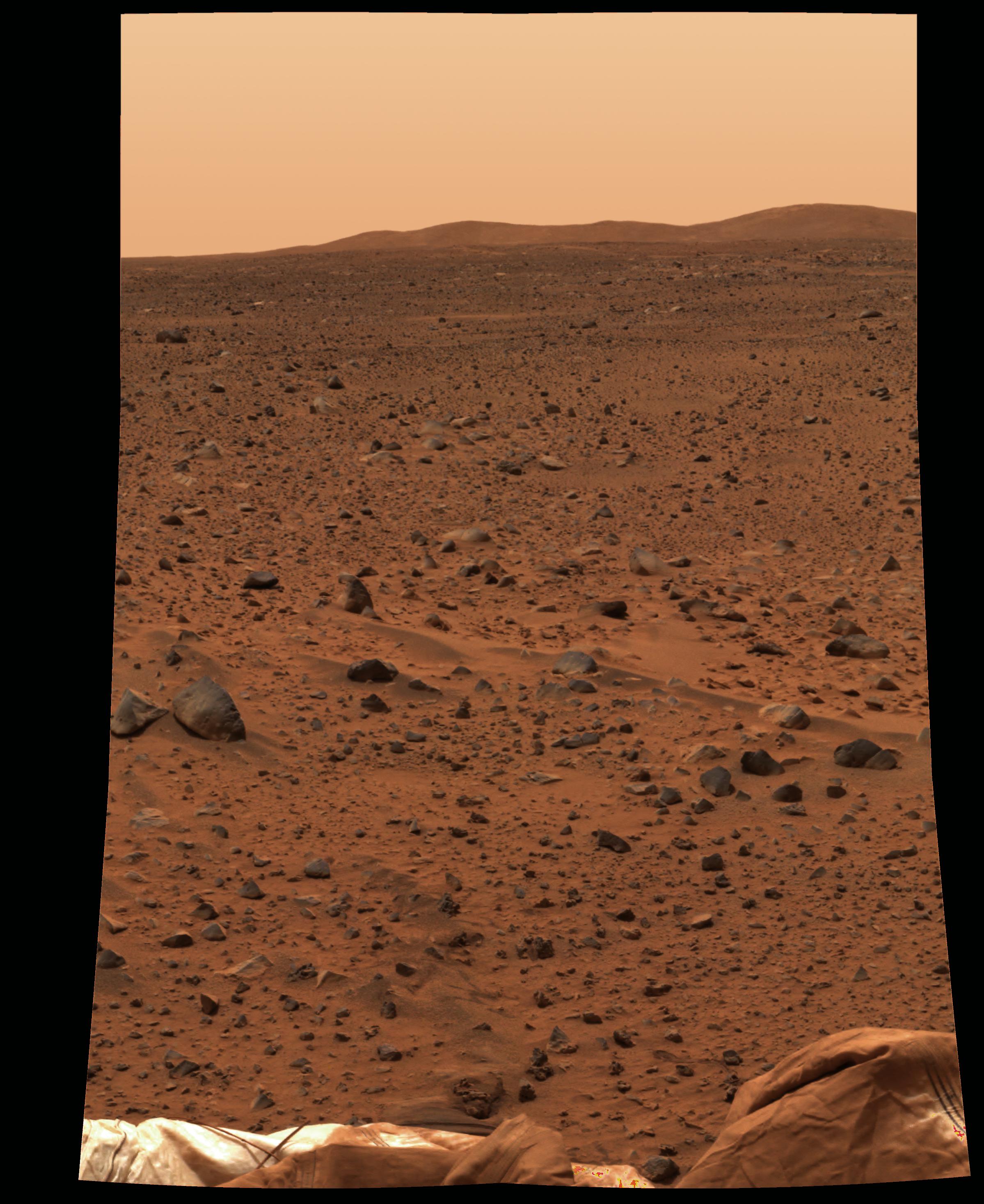 This full-resolution image taken by the panoramic camera onboard the Mars Exploration Rover Spirit before it rolled off the lander shows the rocky surface of Mars. Scientists are eager to begin examining the rocks because, unlike soil, these "little time capsules" hold memories of the ancient processes that formed them. The lander's deflated airbags can be seen in the foreground. Data from the camera's red, green and blue filters were combined to create this approximate true color picture.