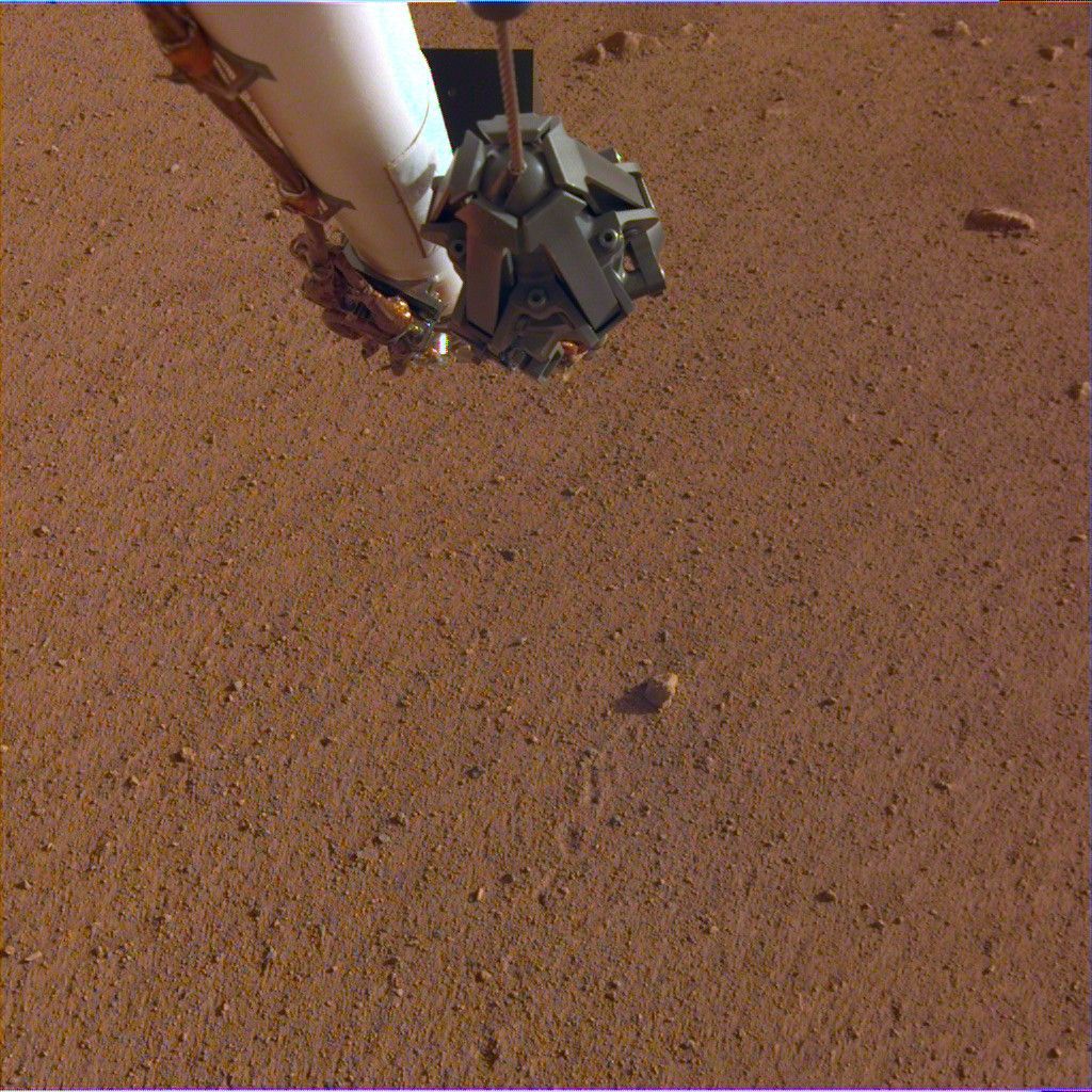 This image, which has been cropped, was taken by the Instrument Deployment Camera (IDC) on InSight's robotic arm. The uncropped image is provided as well.