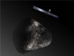 Artist's impression of the Rosetta orbiter at comet 67P/Churyumov-Gerasimenko. The image is not to scale. The Rosetta spacecraft measures 105 feet (32 meters) across including the solar arrays, while the comet nucleus is thought to be about 2.5 miles (4 kilometers) wide.