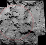 The mosaic comprises two images taken by Rosetta's OSIRIS narrow-angle camera on Sept. 14, 2014, from a distance of about 19 miles (30 kilometers). The image scale is 1.6 feet (0.5 meters) per pixel. The red ellipse is centered on the landing site and is approximately 1,600 feet (500 meters) in diameter.