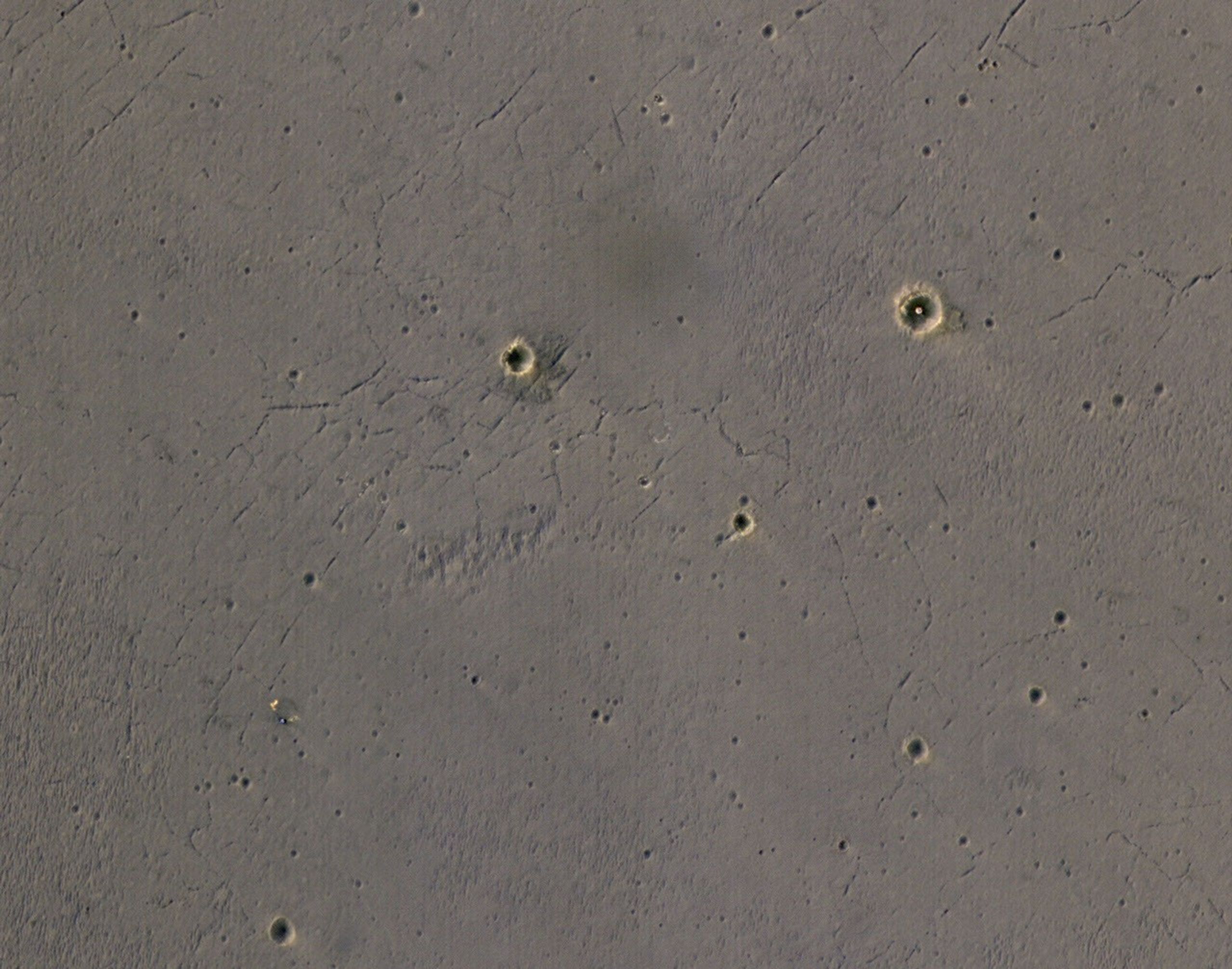 The spacecraft's backshell and parachute, jettisoned during final descent, are visible near the lower left corner of this scene. The blue tint of the backshell is an effect of exaggerated color, because HiRISE combines color information from red, blue-green and infrared portions of the spectrum, rather than three different visible-light colors, so its color images are not true color.