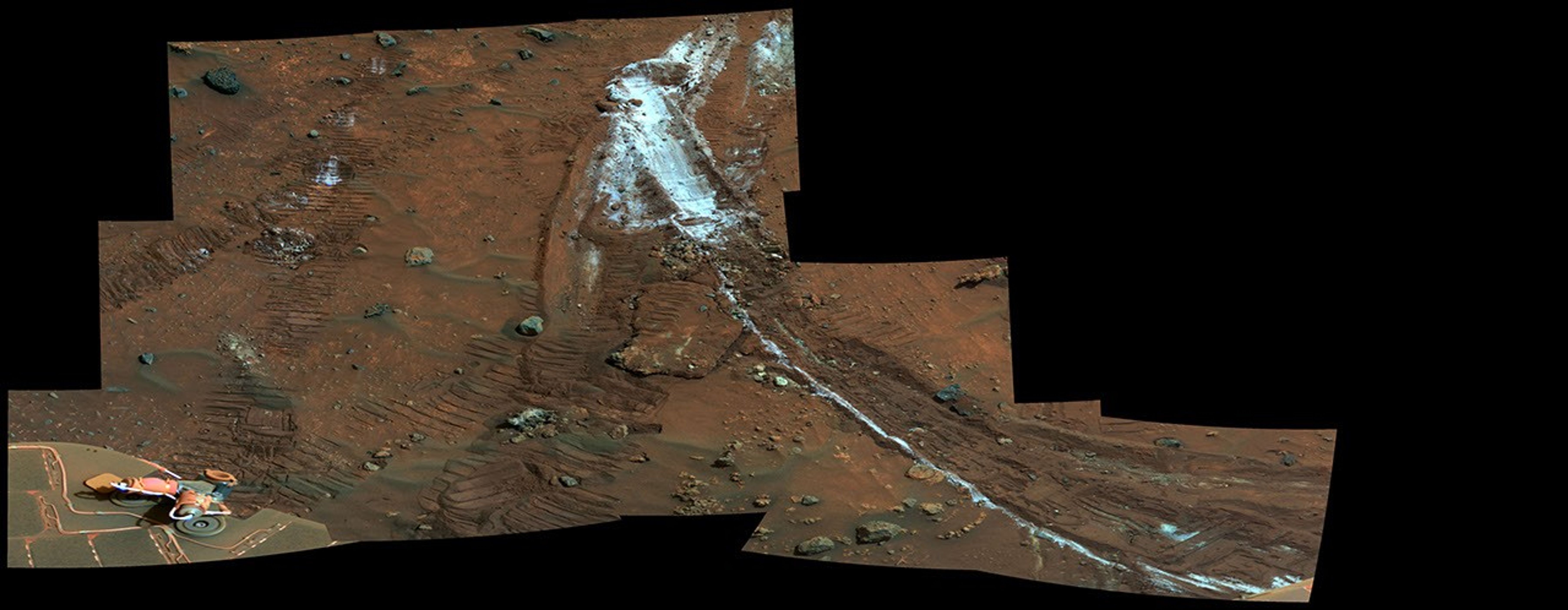 The trench exposed a patch of nearly pure silica, with the composition of opal. It could have come from either a hot-spring environment or an environment called a fumarole, in which acidic, volcanic steam rises through cracks. Either way, its formation involved water, and on Earth, both of these types of settings teem with microbial life.