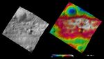 The left-hand image is a Dawn FC (framing camera) image, which shows the apparent brightness of Vesta's surface. The right-hand image is based on this apparent brightness image, which has had a color-coded height representation of the topography overlain onto it. The topography is calculated from a set of images that were observed from different viewing directions, which allows stereo reconstruction. The various colors correspond to the height of the area. The white and red areas in the topography image are the highest areas and the blue areas are the lowest areas. Rubria crater is the middle-sized crater, offset to the bottom right of the center of the image, which has dark and bright material associated with it. This dark and bright material is slumping towards Rubria's center and the dark material forms distinctive rays that spread out around the top part of Rubria. The large, degraded crater in the top tip of the image is difficult to see in the apparent brightness image but is much easier to see in the topography image. The topography image also shows that Rubria formed in a region of high elevation, which is shaded white and pink/ red. The lower boundary of this high region is the trough named Divalia Fossa.