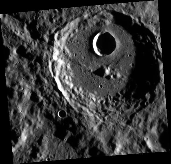 This view from MESSENGER's Narrow Angle Camera shows the impact crater Rude under morning illumination. The crater has small remnant central peaks that are slightly off-center. A sizable impact crater formed on Rude's floor, possibly causing slumping of Rude's northern rim. Francois Rude was a French sculptor who lived from 1784-1855. His statue of "Mercury Fastening his Sandals" is in the Louvre.