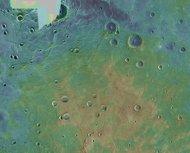 Volcanic smooth plains cover a large portion of Mercury's high northern latitudes. The plains are interrupted by a broad elevated area that rises about 1.5 km (1 mile) above the surroundings. The image presented here is part of the MDIS monochrome basemap that has been color-coded by elevation, with blue representing lower elevation and red representing high elevation. The northern rise, shown in the green and yellow colors (with a hint of red at its highest locations), appears to have formed after the plains were emplaced. The mechanism responsible for the uplift is not yet established; ideas include lithospheric deformation, magmatic intrusion, or mantle dynamic uplift.
