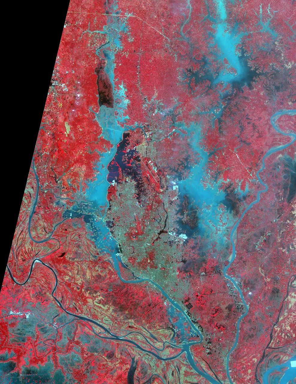Rupganj, Bangladesh was one of the top 3 fastest growing cities in the world between 2000 and 2020. The population increased from 76,000 to 482,000. The ASTER images were acquired November 10, 2000, during a period of flooding; and April 24, 2023. They cover an area of 40.5 by 52.5 km, and are located at 23.7 degrees north, 90.4 degrees east.