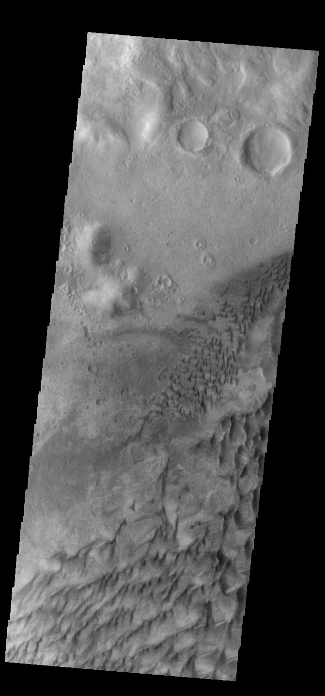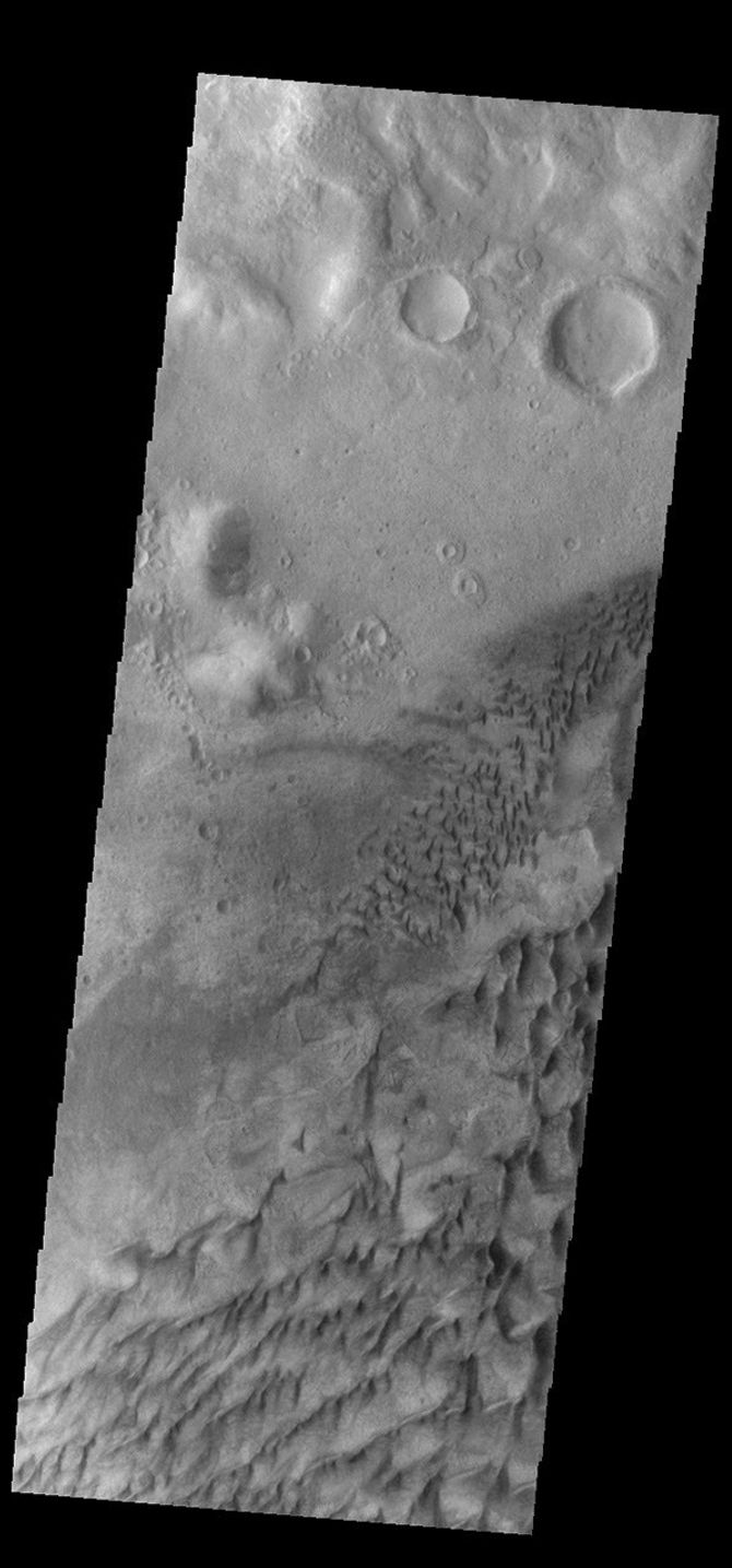 This VIS image shows part of the floor of Russell Crater. Dunes of different shapes and sizes are located on the floor of this 135 km (22 miles) diameter crater. Russell Crater is located in Noachis Terra.