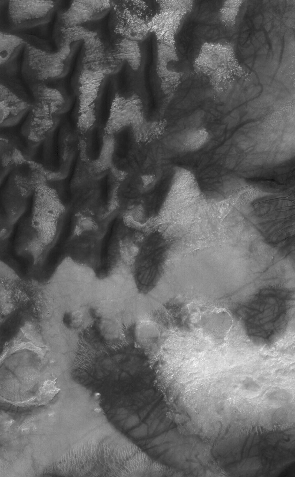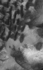 This Mars Global Surveyor (MGS) Mars Orbiter Camera (MOC) image shows dark-toned sand dunes on the floor of Russell Crater in south-central, Noachis Terra. A dune at the right (east) edge of the image is host to several small gullies whose channels extend predominantly to the west-southwest. The formation of these features is not well-understood, but they might result from a combination of downslope movement of sand and a lubricating agent, perhaps carbon dioxide gas or water that had been trapped in the dune as ice. The randomly-oriented dark streaks seen on the dunes and on the interdune surfaces were created by the passage of spring and summertime dust devils.