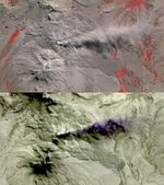 In this image of Peru's Sabancaya stratovolcano, acquired May 13, 2020, the years-long eruption continues. In the top image, Sabancaya has a bright white cloud in its caldera. The greyish cloud to the east is an ash plume. The Ampato volcano, with its prominent summit caldera, is to the south. The red areas are vegetation. The lower thermal infrared composite image shows the plume in purple, indicating that it is dominantly composed of ash and water vapor. A bright hotspot can be seen in the summit caldera of Sabancaya. The images cover an area of 13.5 by 24 kilometers, and are located at 15.8 degrees south, 71.9 degrees west.