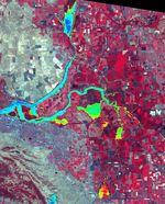 The Sacramento-San Joaquin River Delta, CA (or California Delta) has an area of about 3000 km2, and provides a large fraction of all the water used in California. The Delta drains about 50% of the water coming from the Sierra Nevada Mountains, and channels it through San Francisco's Golden Gate to the Pacific Ocean. Thousands of miles of levees now carefully control the Delta's flow, to maximize water use. The image combines a false color infrared composite (with vegetation depicted in red) with a colorized thermal infrared band to show the water temperature for the larger water bodies. Warmer temperatures are red and yellow, cooler water temperatures are blue and green. The image was acquired July 3, 2012, covers an area of 46.5 by 57.5 km, and is located at 38.1 degrees north, 121.3 degrees west.