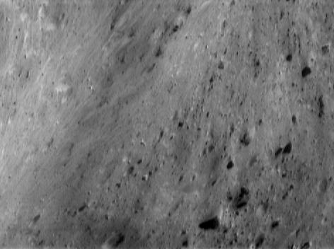 NEAR Shoemaker's camera captured this oblique view of the wall of Eros' saddle on June 19, 2000, from an altitude of 51 kilometers (32 miles). Curvature in the wall, combined with brightness banding in the left portion of the picture, give the surface a surreal, taffy-like appearance. The bright patches may originate from exposure of subsurface material that hasn't been darkened by small impacts and solar wind. These patches are juxtaposed, at the bottom left-center of the picture, with a mysterious dark apron surrounding a 150-meter (490-foot) diameter crater. The whole scene is approximately 1.2 kilometers (0.7 miles) top to bottom.