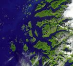 The Arctic Circle cuts through the western coast of Norway and the Saltfjellet-Svartisen National Park. This area features many glacial fjords, alpine mountain formations with glacier tongues, as well as gently sloping mountain plateaus and forested lowland valleys. The largest city here is Mo I Rana, (just off the image to the east) with a population of 25,000 (26th most populous city in Norway). Once supported entirely by the town's steel mill, the area has developed into a tourist center.
