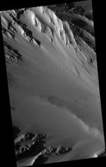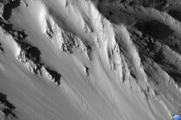 This HiRISE image (PSP_002169_1940) captures one of the cleaner portions of the interior wall of the caldera at the top of Tharsis Tholus.