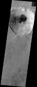 Note: this THEMIS visual image has not been radiometrically nor geometrically calibrated for this preliminary release. An empirical correction has been performed to remove instrumental effects. A linear shift has been applied in the cross-track and down-track direction to approximate spacecraft and planetary motion. Fully calibrated and geometrically projected images will be released through the Planetary Data System in accordance with Project policies at a later time.