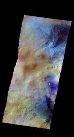 The THEMIS VIS camera contains 5 filters. The data from different filters can be combined in multiple ways to create a false color image. These false color images may reveal subtle variations of the surface not easily identified in a single band image. Today's false color image shows two large sand dunes. The dunes are the dark blue ridged features at the upper and lower right of the image. This image is located west of Argyre Planitia.