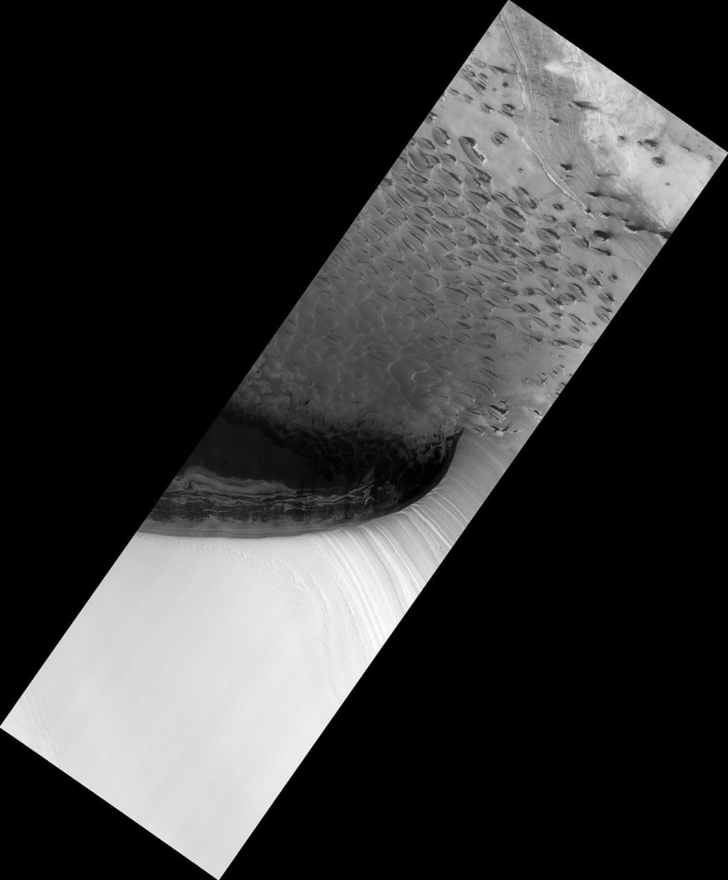 Mars' northern-most sand dunes are beginning to emerge from their winter cover of seasonal carbon dioxide (dry) ice. Dark, bare south-facing slopes are soaking up the warmth of the sun.