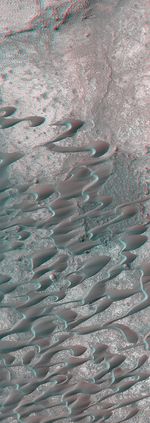 One of the very first places photographed by the MOC at the start of the Mapping Mission in March 1999 was a field of dunes located in Nili Patera, a volcanic depression in central Syrtis Major. A portion of this dune field was shown in a media release on March 11, 1999, "Sand Dunes of Nili Patera, Syrtis Major." Subsequently, the image was archived with the NASA Planetary Data System, as shown in the Malin Space Science Systems MOC Gallery. On April 24, 2001, an opportunity arose in which the MGS could be pointed off-nadir to take a new picture of the same dune field. By combining the nadir view from March 1999 and the off-nadir view from April 2001, a stereoscopic image was created. The anaglyph shown here must be viewed with red (left-eye) and blue (right-eye) "3-D" glasses. The dunes and the local topography of the volcanic crater's floor stand out in sharp relief. The images, taken more than one Mars year apart, show no change in the shape or location of the dunes--that is, they do not seem to have moved at all since March 1999.